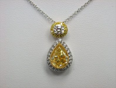 Fancy Light Yellow Pearshaped and Round Pendant 1.51 ps fly vvs2 gia 0.22 ct wh br top 0.10 tw fly melee 0.17 tw wh melee 27.87 ct tw