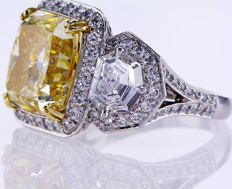 Fancy Yellow Radiant and Shield Ring 9.44 ct fy rad center 1.84 tw wh shields 1.32 tw wh melee note: made with P18YG