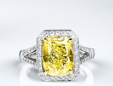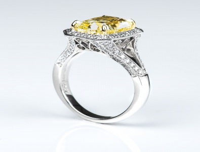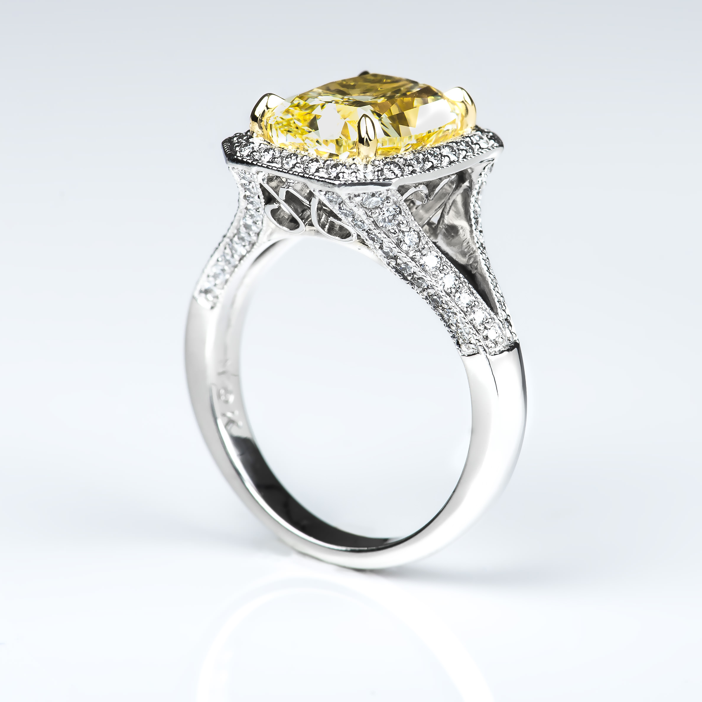 Fancy Light Yellow Cushion Pave Ring 4.15ct cushion fly vs2 GIA 0.61 ct tw melee 51.15 ct tw