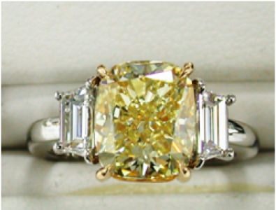 Fancy yellow Cushion and Trapezoid Ring 4.05 ct fy cushion center 0.80 tw wh trapezoids note: made with P18YG