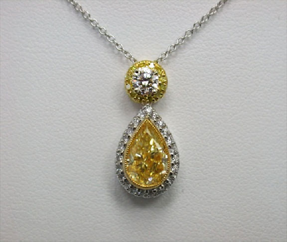Fancy Light Yellow Pearshaped and Round Pendant 1.51 ps fly vvs2 gia 0.22 ct wh br top 0.10 tw fly melee 0.17 tw wh melee 27.87 ct tw