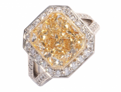 Fancy Light Yellow Radiant Pave Ring 7.54 ct fly rad center 1.58 tw melee sides 73.97 ct tw note: made with P18YG