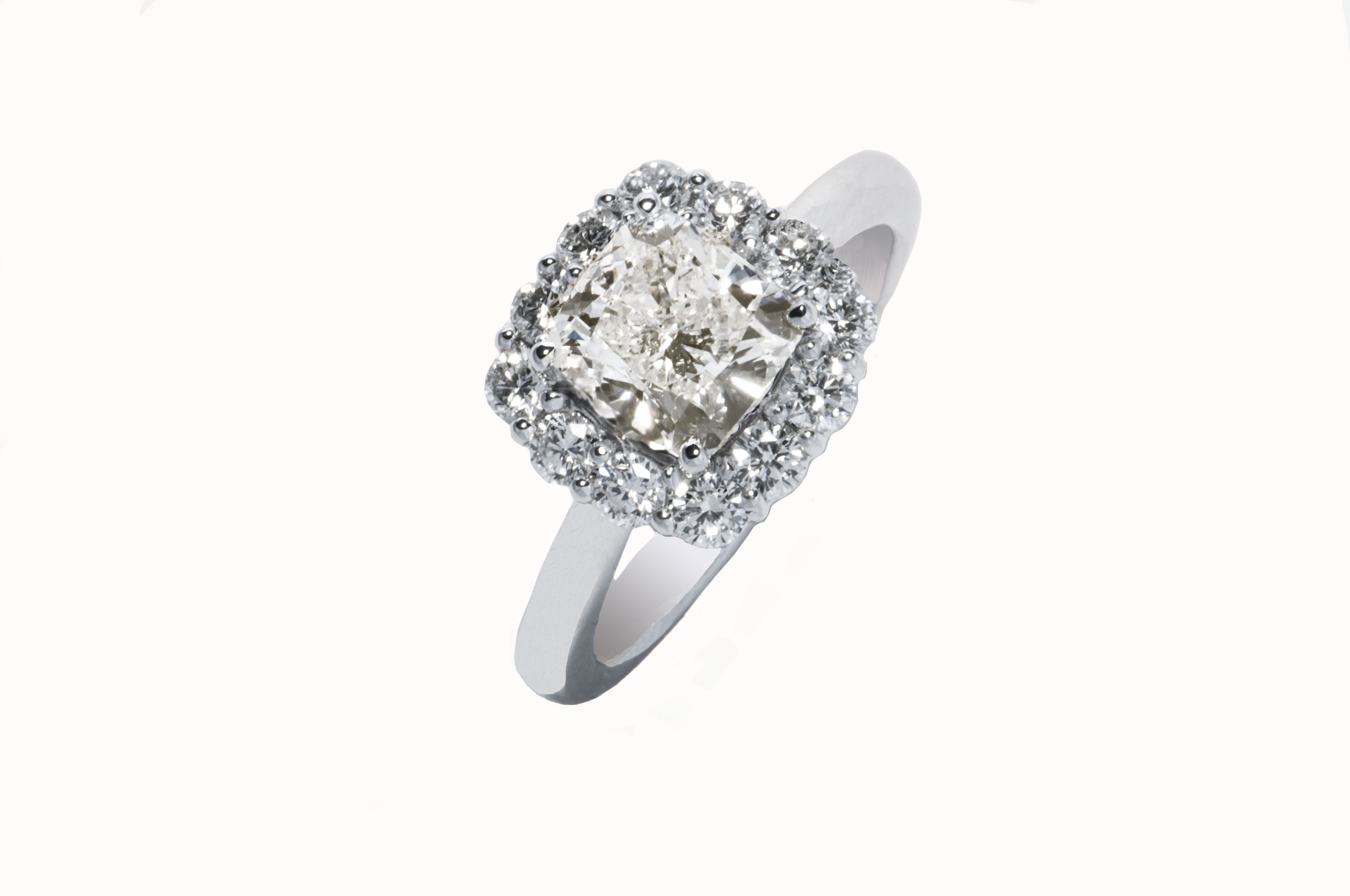 Cushion Halo Ring 1.71 ct wh cu center 0.64 ct tw br melees 27.34 ct tw
